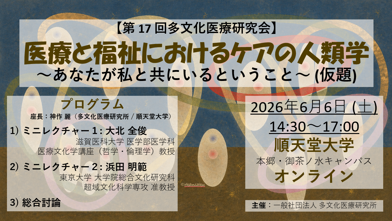 第 17 回多文化医療研究会「医療と福祉におけるケアの人類学~あなたが私と共にいるということ~ (仮題)」